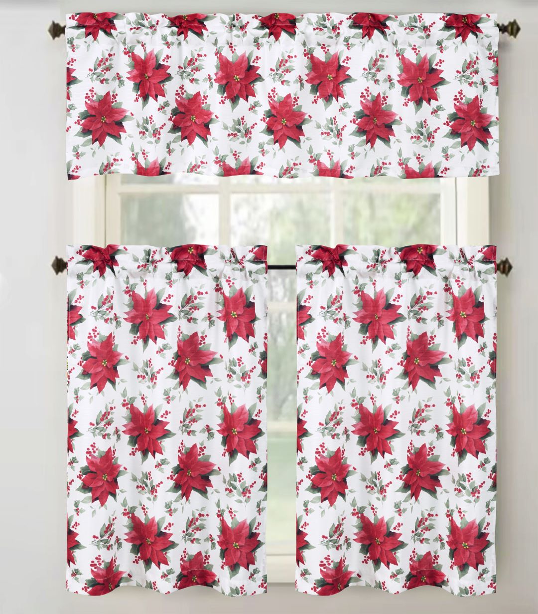 Christmas Holly Poinsettia Printed Kitchen Curtain